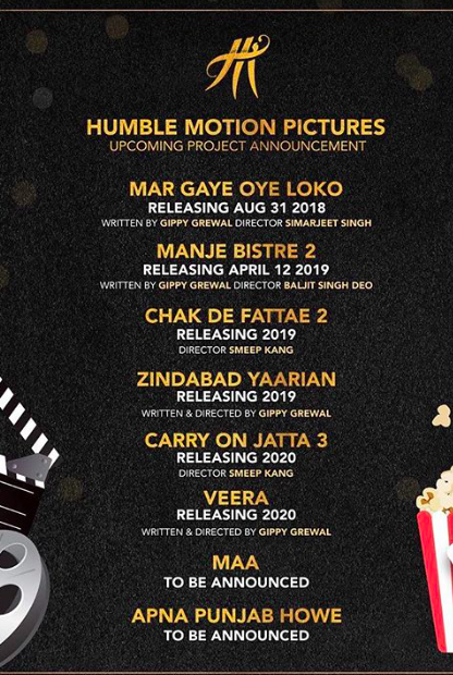 ਪੰਜਾਬੀ ਮਿਊਜ਼ਿਕ ਅਤੇ ਫ਼ਿਲਮ ਇੰਡਸਟਰੀ ਦਾ ਮਲਟੀਟੇਲੈਂਟਿਡ ਸਟਾਰ ਗਿੱਪੀ ਗਰੇਵਾਲ ਆਪਣੀ ਗਾਇਕੀ ਅਤੇ ਅਦਾਕਾਰੀ ਦੇ ਨਾਲ ਨਾਲ ਆਪਣੀ ਲਿਆਕਤ ਅਤੇ ਮੈਨੇਜਮੈਂਟ ਕਾਰਨ ਵੀ ਜਾਣਿਆ ਜਾਂਦਾ ਹੈ। ਗਿੱਪੀ ਗਰੇਵਾਲ ਅਤੇ ਉਸਦੀ ਟੀਮ ਮਨੋਰੰਜਨ ਜਗਤ ‘ਚ ਲਗਾਤਾਰ ਆਪਣਾ ਦਾਇਰਾ ਵਿਸ਼ਾਲ ਕਰਦੀ ਹੋਈ, ਵੱਡੀਆਂ ਪ੍ਰਾਪਤੀਆਂ ਹਾਸਲ ਕਰ ਰਹੀ ਹੈ। ਗਿੱਪੀ ਗਰੇਵਾਲ ਦੀ ਕੰਪਨੀ ‘ਹੰਬਲ ਮੋਸ਼ਲ ਪਿਕਚਰਜ਼’ ਵੱਲੋਂ ਆਪਣੀ ਅਗਲੇ ਦੋ ਸਾਲਾਂ ਦੀ ਵਿਉਂਤਬੰਦੀ ਜਨਤਕ ਕੀਤੀ ਗਈ ਹੈ। ਇਸ ਸਬੰਧੀ ਗਿੱਪੀ ਵੱਲੋਂ ਆਪਣੇ ਫ਼ੇਸਬੁੱਕ ਪੇਜ਼ ‘ਤੇ ਖੁਸ਼ੀ ਸਾਂਝੀ ਕਰਦਿਆਂ ਦੱਸਿਆ ਗਿਆ ਹੈ ਕਿ ਉਹਨਾਂ ਦੀ ਟੀਮ ਵੱਲੋਂ ਅਗਲੇ ਦੋ ਸਾਲਾਂ ਯਾਨੀਕਿ 2020 ਤੱਕ 8 ਫ਼ਿਲਮਾਂ ਦਰਸ਼ਕਾਂ ਦੀ ਝੋਲੀ ਪਾਈਆਂ ਜਾਣਗੀਆਂ, ਜਿਨ•ਾਂ ‘ਚੋਂ ਪਹਿਲੀ ਫ਼ਿਲਮ ‘ਮਰ ਗਏ ਓਏ ਲੋਕੋ’ ਇਸੇ ਸਾਲ 31 ਅਗਸਤ ਨੂੰ ਰਿਲੀਜ਼ ਹੋਵੇਗੀ। ਗਿੱਪੀ ਗਰੇਵਾਲ ਦੀ ਮੁੱਖ ਭੂਮਿਕਾ ਵਾਲੀ ਇਸ ਫ਼ਿਲਮ ਦੀ ਕਹਾਣੀ ਗਿੱਪੀ ਦੀ ਹੀ ਹੈ।